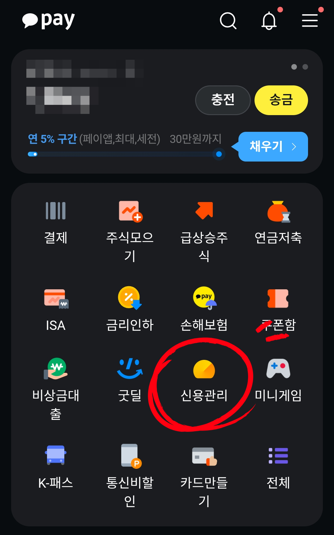 : [카카오페이] -> [자산] -> [신용관리] 메뉴에서 '신용점수 올리기'를 통해 공공요금, 통신비 내역을 제출하세요. 2026년에는 이 데이터를 통해 대안신용평가가 이루어지므로, 금융 거래 이력이 적은 사람도 고득점이 가능합니다. - 대출 갈아타기 기능 활용