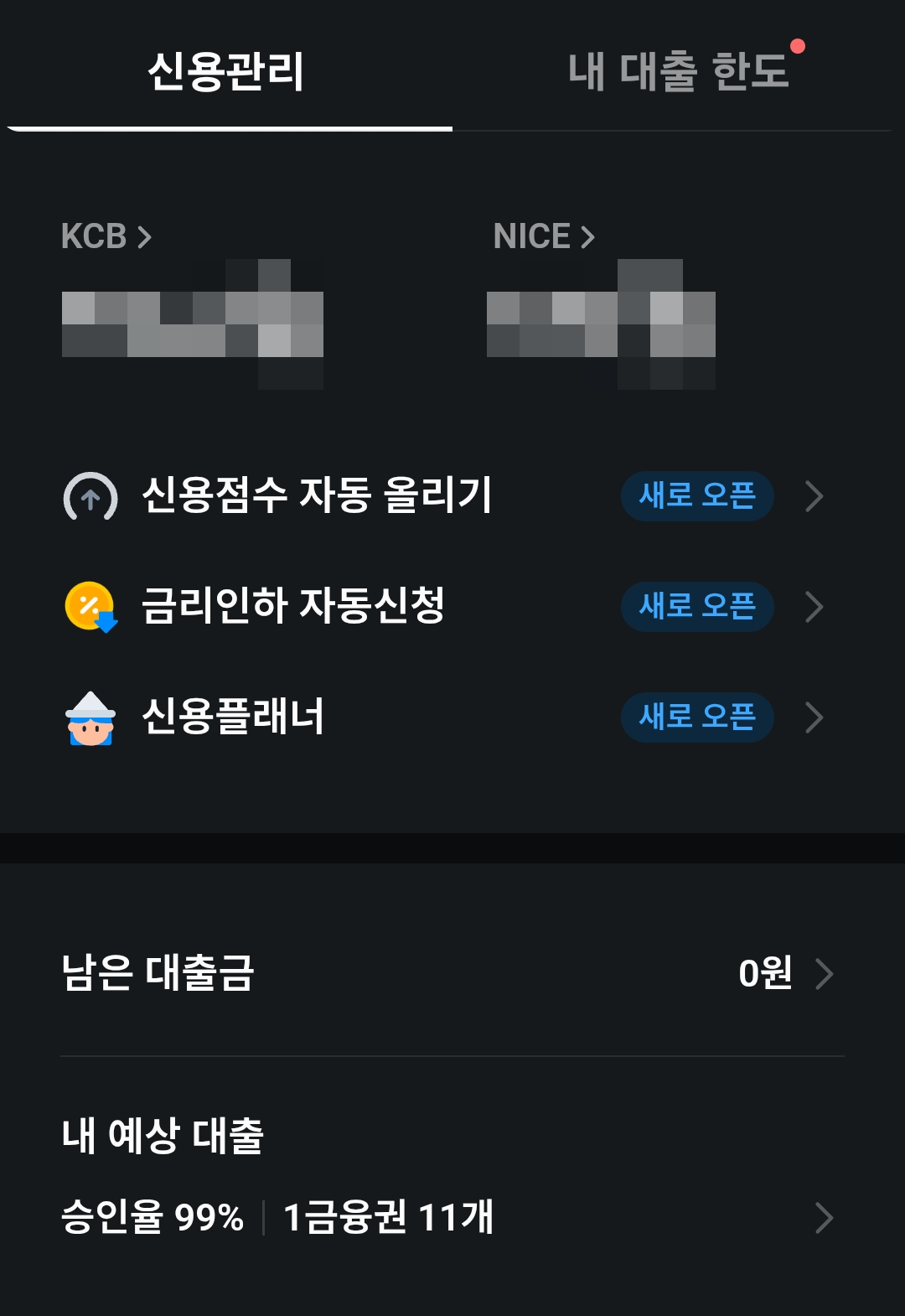 : [카카오페이] -> [자산] -> [신용관리] 메뉴에서 '신용점수 올리기'를 통해 공공요금, 통신비 내역을 제출하세요. 2026년에는 이 데이터를 통해 대안신용평가가 이루어지므로, 금융 거래 이력이 적은 사람도 고득점이 가능합니다. - 대출 갈아타기 기능 활용